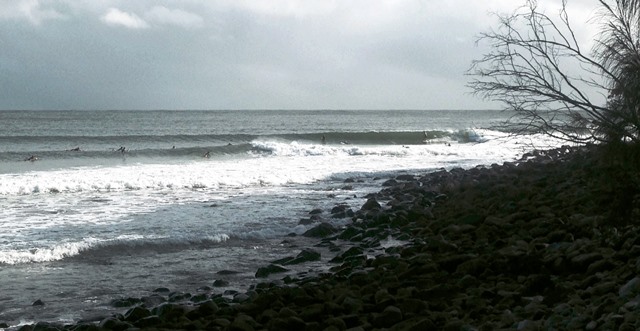 Noosa lumpy but 3-4ft- loads of waves with a dropping big spring tide. Powerful and hollow! Pulled a floater at nationals, bounced the landing and board rail slipped upwards and smashed my left elbow and ribs! Lots of ice that night:(